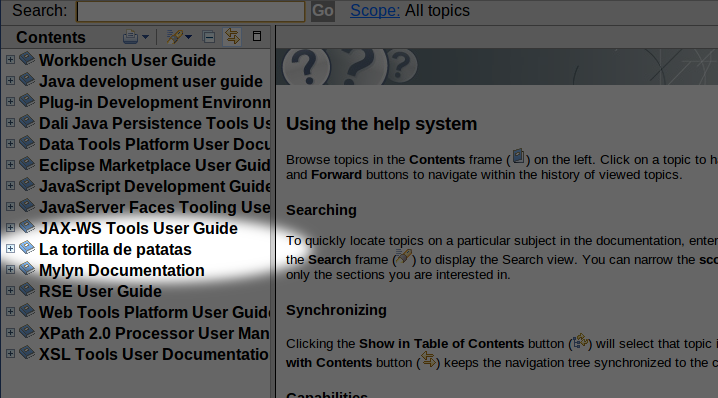 <?xml version="1.0" encoding="UTF-8"?> <toc label="La tortilla de patatas" href='toplevel.html'> <topic label="Section 1" href="section1.html"/> </toc>