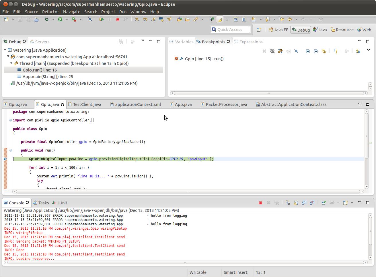 It's my eclipse running a PI4J program, directly. The PI calls are packaged, sent over the network to the raspberry pi and there a server executes them, receives the answer and send the answer back to the computer.