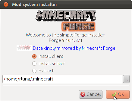 <WRAP center round info 60%> Si no funciona, es muy posible que el paso 2 (ejecutar minecraft forge), se haya echo mal. Implica descargar varias librerías, y si falla, informa de que se han descargado 0 librerías y se queda tan pancho. En ese caso, lo mejor es eliminar al completo el directorio .minecraft y empezar con uno nuevo. Luego se pueden recuperar los mundos copiando la carpeta saves del antiguo directorio .minecraft. </WRAP>