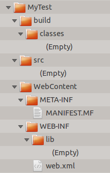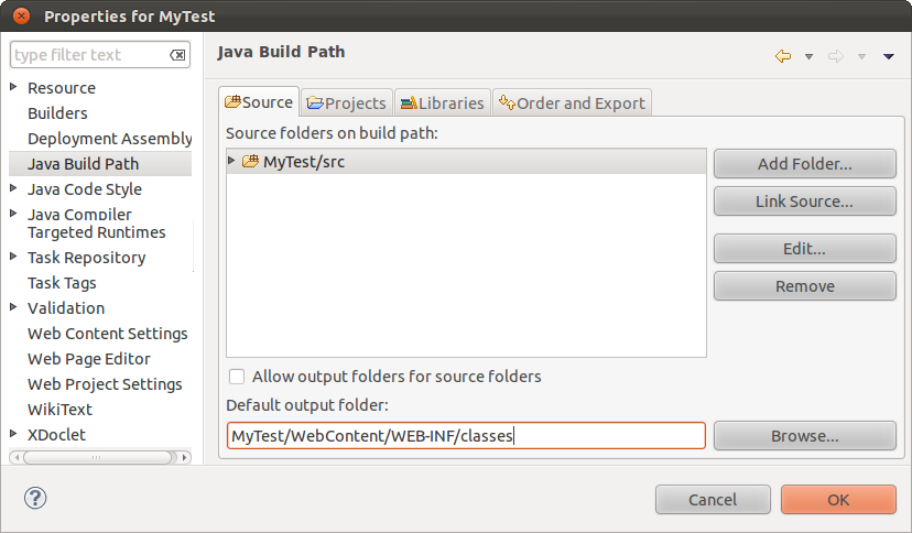 So, right-click on MyTest → properties → Java Build Path and configure the directory so that the binaries are left in the WEB-INF directory: