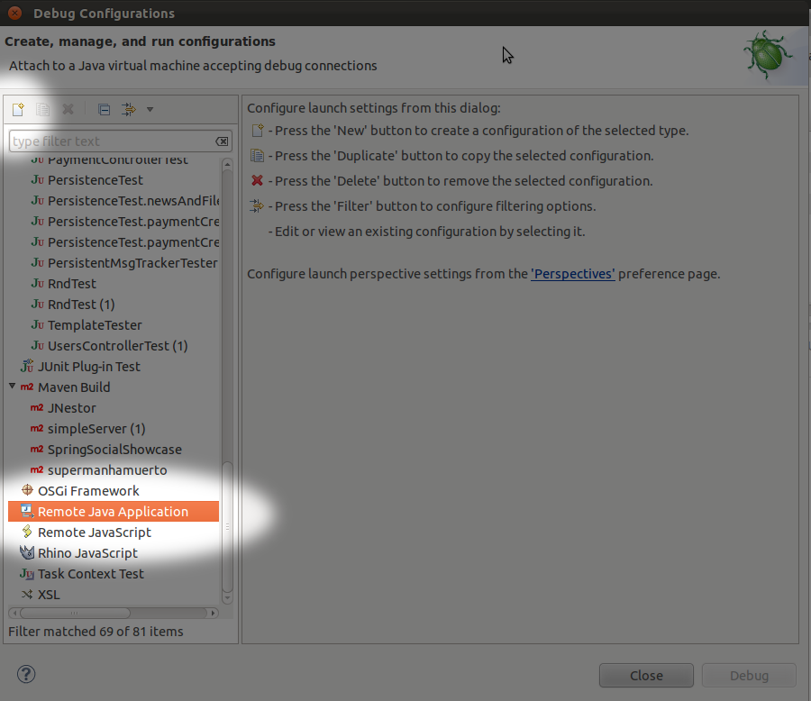 In your eclipse click on run → debug configurations. Under “Remote Java application” click on “new”: