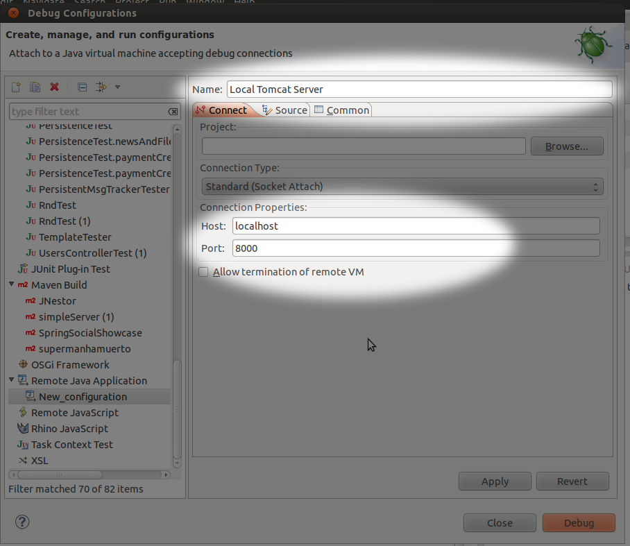 For debug in eclipse, open the “Debug configurations…” option: